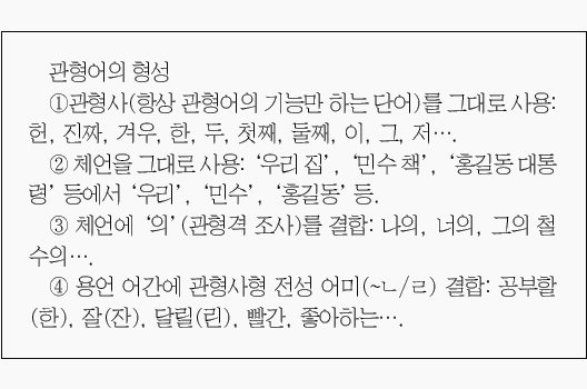 ◆정원석의 무결점 논술 / 5. 문법적 문장 표현의 비결◆ 문장 성분 간 호응 오류 가운데 가장 흔한 것 중 하나가 바로 부속성분(주성분의 내용을 꾸며 뜻을 더해주는 문장 성분: 부사어, 관형어 등)과 주성분 사이의 호응에서 빗나가는 경우다. 이번주부터는 꾸미는 문장 성분과 그 꾸밈을 받는 문장 성분 간의 호응에 초점을 맞춰 문법적 문장 서술의 비결을 살펴보도록 하겠다. ★ 관형어 이번주에는 먼저 관형어에 초점을 맞추어 기본 이해부터 쌓아 보도록 하겠다. 관형어는 체언을 수식해 주는 문장 성분이다. 먼저 다음과 같은 방법으로 관형어를 만들 수 있다는 점부터 기억해 두자.