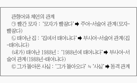 똑같이 [용언 어간+관형사형 전성 어미] 형태로 관형어를 형성하더라도 그 관형어와 수식을 받는 체언 사이에는 대체로 다음과 같은 관계가 성립한다. 각 [관형어+체언]의 구(句) 형태마다 절(節:주어와 서술어 형태를 갖춘 단위) 형태로 바꿔 본다는 관점에서 분석해 보면 이해가 쉬울 것이다. 영문법에 익숙한 학생이라면 'that'이 주격, 목적격
