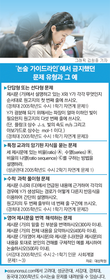 실제로 2008학년도 서울대 고려대 연세대 등의 정시논술 자연계 문제는 이미 논술 가이드라인을 벗어난 형태로 출제됐다는 논란에 휩싸여 있다. 서울대는 극한과 함수, 체지방률, 복사에너지 등 구체적인 수치를 구하라는 문제를, 고려대는 전구에서 방출되는 에너지의 총합을 구하라는 문제를, 연세대는 바다에서 기름 유출 사고가 발생한 후 기름이 육지에 도달하는 시간을 계산하라는 문제를 각각 출제했다. 제시문이 주어졌다는 것을 제외하면 정답이 정해져 있고 풀이 과정도 분명해서 논술 가이드라인에서 금지한 ‘풀이형 문제’에 가까웠다.