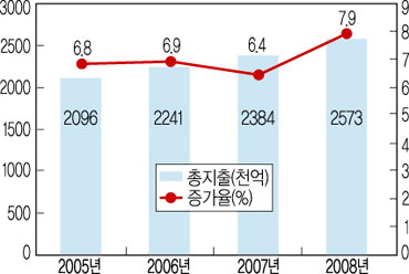 이처럼 우리의 경우 구호만 무성했을 뿐, 작은 정부라는 표현에 적합한 정부가 구현됐던 기억은 남아있지 않다. 당장 정부예산만 보더라도 꾸준히 증가세를 그려왔음을 알 수 있다. 특히 참여정부 5년간의 예산증가는 상당했다. 그래프를 통해 파악할 수 있는 것처럼, 당장 올해의 예산만도 지난해에 비해 8%가량이 늘었다. 절대 액수만도 250조원을 훌쩍 넘어섰다.