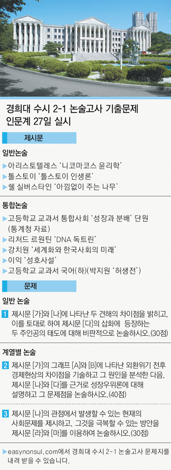 1개 문제를 내는 경희대 일반논술(1000자, 60분)은 제시문을 고전에서 출제하는 대신 문제가 쉬운 편. 제시문을 정확히 이해한 뒤 이를 깊이 사고해 ‘자기화’한 다음 자신의 창의적인 생각을 풀어쓰는 문제다.