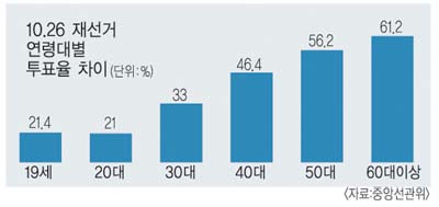 연령대별 투표율 격차도 갈수록 커지고 있다. 젊은층의 투표율 하락이 우려를 넘어 최악의 상황으로 가고 있는데, ‘그래프2’를 보면 만 19세가 처음으로 선거권을 갖게 되었던 2005년 10·26 재선거의 경우 19세나 20대의 투표율이 60대 이상의 3분의 1 수준임을 확인할 수가 있다.
