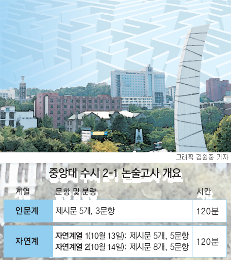 중앙대는 인문계와 자연계를 가릴 것 없이 언어논술과 수리논술을 모두 보아야 했던 기존 시험 유형을 올해부터 바꿨다. 인문계는 통계자료를 해석하는 문제로 수리논술을 대체했고, 자연계는 과학을 소재로 한 짧은 글쓰기로 언어논술을 대신했다.