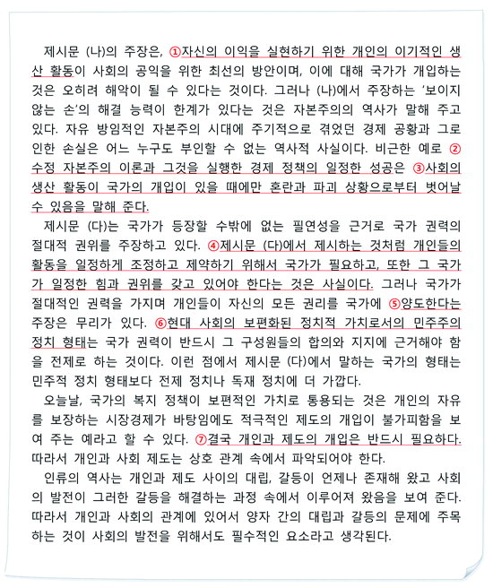 다음으로 앞의 논의에 이어서 그 주제에 대한 자신의 견해를 제시해야 한다. 주제에 대한 평소 사고의 깊이를 측정하는 문제다. 이때 어떤 관점을 가지는지 학생이 판단하면 된다.